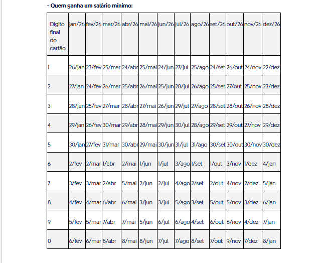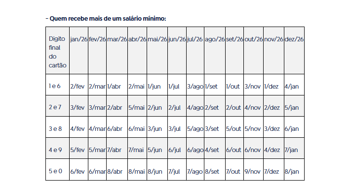 Os depósitos seguirão a sequência de anos anteriores, com um calendário para quem recebe um salário mínimo e outro para quem ganha mais de um salário. Para cada categoria, as datas de pagamento serão determinadas pelo número final do cartão, sem considerar o dígito verificador (que vem depois do traço).